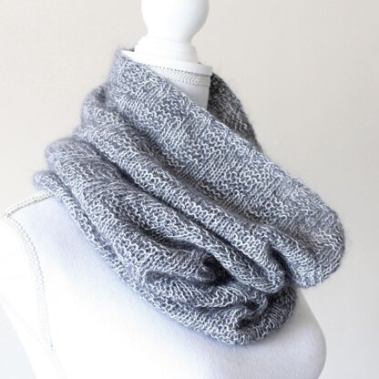 Soft and stylish, Argentum is worked seamlessly in the round using fingering yarn held together with a contrasting colour of lofty mohair lace yarn. Argentum mixes neat twisted rib edges with a subtle stepped garter stitch pattern to create textural and visual interest.