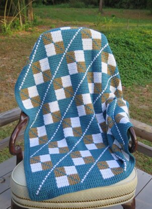 Deceptively simple and fun to make, this pattern uses the star stitch and shades of Camel, Clarity, and Peacock to produce a bold argyle design. Working over the color not in use, creates a reversible fabric. A four-row border of star stitch is added after the main body of the afghan is complete. This pattern is suitable for either sport or DK yarns.