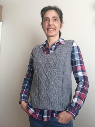 The ARGYLE sleeveless sweater is worked from bottom to top. the bottom rib is worked back and forth to create a slit on each side, then the body is worked in the round up to the armholes. Then the front and back are worked back and forth to the shoulders, which are closed with a 3 needle bind off. Then, stitches are picked up to finish the neckline and armholes. This sweater is made to be worn with a positive ease of + ¾’’. Please take this into consideration when selecting your size. Refer you to measurements table and sketch, to choose you size.