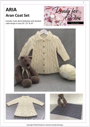 Aria is my granddaughter and this is my first published pattern after knitting and designing for over 45years. It's a beautiful detailed cable design with matching blanket and moss stitch beret. Instructions are for 20", 22" and 24" chest sizes using 4.5mm needles and 26" chest with 5.00mm needles. The coat has a combination of 4 different cables with reverse stocking stitch and moss stitch and is knitted with aran/worsted/10ply weight yarn