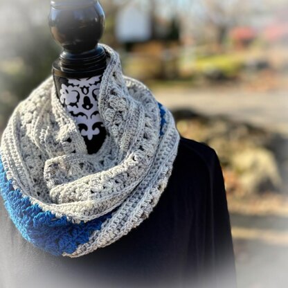 The cowl is worked in one piece, beginning with 2 rounds of single crochet. The 6 round pattern repeat includes the modern granny stitch (which employs double crochets and double crochet 3 together), half double crochets, and camel stitch (half double crochet worked in the 3rd loop).