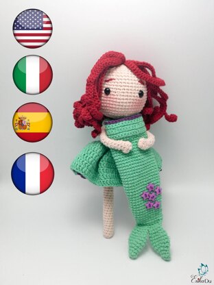 Ariel the mermaid is an amigurumi doll with interchangeable clothes. Hands and legs are bendable. This a crochet doll pattern is for making the doll.