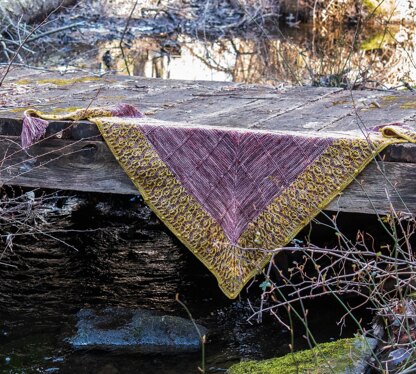 Knit with fingering weight yarn, Arising features a garter stitch body embellished with rays of slipped stitches. The delicate brioche that follows is reminiscent of tiny buds, reaching up for the first warm days of Spring. A garter stitch border adorned with petite bobbles creates a tidy edge.