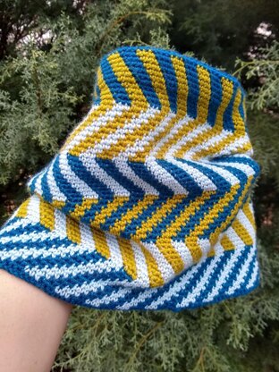 A cowl inspired by my knitted design Autumn’s Draft Cowl. The idea started with thoughts of different colors of the leaves and how the wind blows them in different directions and it transferred to a pattern that uses a geometrical arrow-like stitch pattern and 3 different colors of the yarn. But of course, you can use not only fall colors but many other different combinations, just make sure, all the 3 colors have enough contrast between each other.