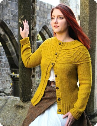 With an unusual construction using a sideways knit cabled strip with German short rows to form a crescent shape for the yoke detail, Arthington is an interesting and satisfying knit. Integral icord details and princess line shaping add further interest, overall creating a flattering cardigan.