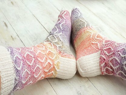 Aruma means 'happy' in a local aboriginal language, and it is a fitting name for these socks. All those colours and the lovely floating diamond shapes make me happy. Worked from the top down and featuring a reinforced heel and toe, these socks are fun to knit and gift. Instructions include tips on adjusting for differernt size feet and two versions, a single coloured, as well as the striped version. Sizes: Women’s to fit a foot circumference of between 20 to 23 cm, or 8 to 9 inches, sock height and length are adjustable, this way the socks can be made to fit most feet( shoe sizes of 7 to 12) Materials: 100 g sock yarn in total for one pair in one colour, or 60 g natural/ solid and 40g variegated/ gradient for the striped pair Yarn Suggestions: Regia 4 Ply 100g Natural Austermann Step (Ennis)