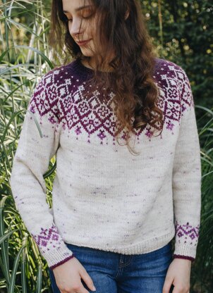 Asara is a top-down seamless yoke sweater that is knit in the round. There is a ribbed neckline followed by short rows at the back of the neck for a comfortable fit. The yoke features stranded colourwork that inverts in colour. There is optional waist and hip shaping to add feminine shape, and the hem is finished off with ribbing. The sleeves are finished off with stranded colourwork that highlight the yoke motif and ribbing. Asara was inspired by Polish embroidery from the Małopolska region.