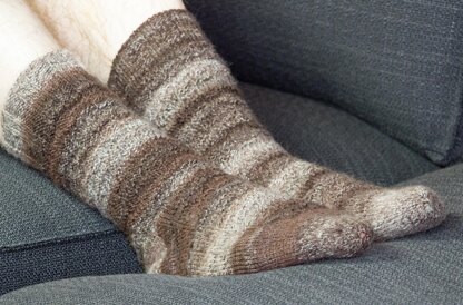 I made the smaller size for my husband, who has shoe size 42/43 (US 9/10) and they fit him just fine, so give it a try if you want a smaller size. I used 2 skeins of Drops Fabel.