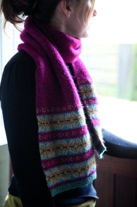 This shorter length Fairisle scarf (from Martin’s Nordic Knits) is a lovely starter Fairisle project bands of Fairisle pattern at each end of the scarf. The scarf uses seven colours of Rowan Felted Tweed, with main part of the scarf in stocking stitch in just one of these colours. It has only two colours in a row.