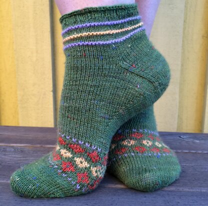 The socks have a short leg and are knit in the round with a heel flap heel and a gausset. The heel extension is made using short rows. This pattern is written to be knit on a circular needle with the Magic Loop method but if you rather use dpns you can adjust it for your needs.