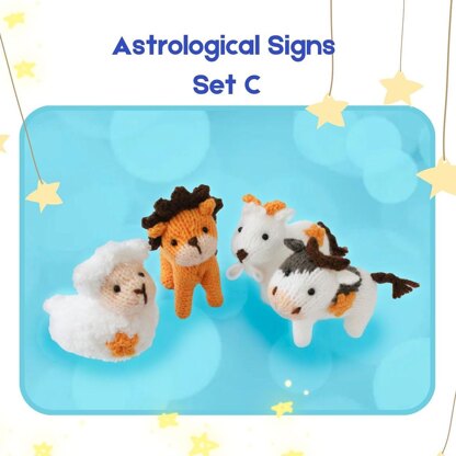 Astrological Signs Set C Aries, Taurus, Leo, Capricorn Finished size: 8cm All parts are knitted flat and sewn up at the end. No circular knitting is required. The project requires small quantities of DK (8-ply) yarn and textured fleecy yarn, providing a perfect opportunity to utilize any leftover yarn you may have. 9 pages with some step photos