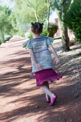 Whimsical, colorful, fun-tastical were the essential elements that I wanted to incorporate into my latest “Tee!”. When my daughter saw The Fiber Seed’s “Where the Sidewalk Ends” colorway, she asked if I could make a top just for her- as ruffly and frilly as possible, please! This color has the most subtle pops of purple, orange and green, inviting you to play with color choices and add a bit of flair to your wardrobe. “At Sidewalk End” is where you find all those Seusical moments coming together. With some added fun details, like ruffled sleeves and bows, this top is sure to become a favorite of the little girls in your life. Tee is knit from the top- down, seamlessly, in the round.Edges are made with an Applied I-cord. Sleeves can be made more fitted with I-cord bows that weave through the eyelet holes of the sleeves.