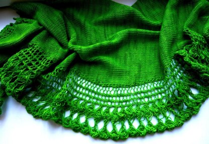 The body is knit in plain stockinette - could be knitted in garter stitch for a completely reversible shawl.