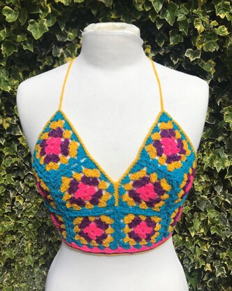The back of the top is laced up corset-style, so it can easily adjust to fit. This pattern is great for using up scraps of yarn. Each square is joined as you go, so there is no seaming up afterwards.