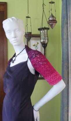 Graceful and feminine, this shrug will transport you back to a time when dressing up was a part of going out for the evening, and is also the perfect accompaniment to wear to any formal occasion. The raglan back armholes ensure a good fit across the back. The lower sleeves and back bottom edge are all begun separately, then joined to work in one piece to the top, with raglan shaping at the back and backs of sleeves only. Make this delightful shrug in a solid color or gradient shades for very different looks. The two smallest sizes of the gradient version, when using an Artfil Belle gradient bundle (20 gram hanks each of six colors) will use only one bundle, so make sure to evenly divide each of the two lightest shades into two evenly sized balls.