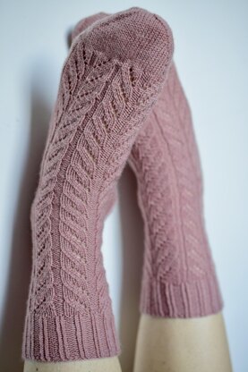 In this pattern you can learn or practice the Twisted German Cast-on technique (also known as Old Norwegian Cast-on), an easy, yet very engaging lace pattern, called Cascading Leaves, and the Kitchener stitch. The socks are knitted from the top down and come with three lengths of toe. Enjoy!