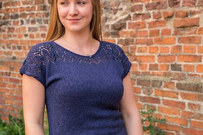 „Aureliana“ is a light summer tee with wide boat neck and beautiful lace details. Loosely fitted, but not too oversized, it is worked seamlessly from the top down and shaped with short rows around the neck and shoulders. Optional bust darts and waist shaping. Both Front and Back are worked flat separately to the underarm, and then joined in the lower body to be knit in one piece in the round. The garter stitch neck and sleeve bands are worked last.