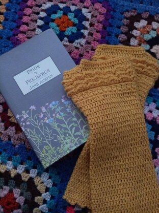 Inspired by Jane Austen and Bridgerton, these long fingerless gloves have a romantic, feminine frill section which sits low on the hand.