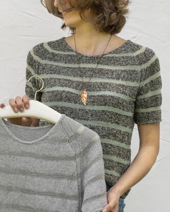 Australis Tee is knit top-down and is completely seamless. It is worked predominantly in the round. An attached progress chart helps to keep track of all increases and stripe sequence changes.