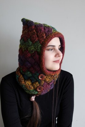 This balaclava is knit flat and then seamed, but the face opening binding is knit in the round. You will need knitting needles for knitting flat and for knitting in the round, both the same size to obtain the gauge.