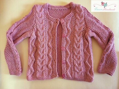 Yarn weight is Sport , 12 wpi, 3 balls of Alize Cotton Baby Soft (cotton 50%, Acrylic 50%) , 270 mt 100g ball, color pink Tension: 19 stitches * 26 rows = 10 cm * 10 cm in Stockinette stitch Needles used: Straight or circular knitting needles of size 4 mm Buttons 5 each of diameter 1.5 cm