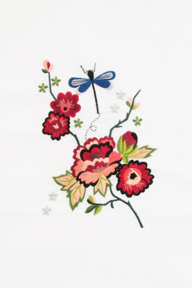 Rich pinks and reds stand out in this effortlessly romantic peony and dragonfly design. This free pattern, suited for advanced-level embroiderers, offers a project with style and sophistication