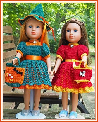 Designed for popular 14.5” vinyl body little girl dolls such as Wellie Wishers™, Glitter Girls®, Hearts for Hearts Girls™, Ruby Red Fashion Friends, etc. (Chest approx. 7”, waist approx. 6”), this versatile ensemble crocheted in size 10 cotton thread includes Dress with Attached Petticoat, Witch’s Hat, Treat Tote, and Purse.