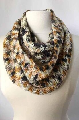 Originally designed for the Artyarns September 2019 Inspirations Club, this cowl is great for any transition! The herringbone stitch gives movement to the fabric and hand-painted yarn. Piece measures 7.5" (19 cm) wide x 48" (120 cm) circumference. Shown in September 2019 Inspirations Club Color, Transitions (primarily whites, golds, greys) and in Color #1040 (silver, charcoal, copper, navy)