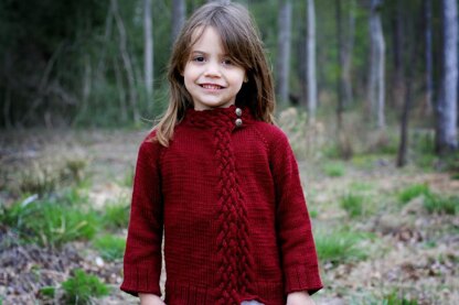 This pattern is an asymmetrical cardigan with a cabled collar and front panels. The cardigan is knit in one piece from the top down in raglan style and is seamless. With several options for sleeves and bind-offs, it is easy to customize for the perfect style and fit.
