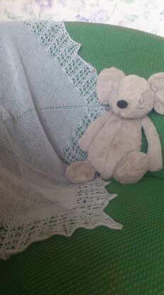 The blanket shown used less that 400m of laceweight yarn. The pattern shows how to add lace repeats and could be made in a heavier yarn for a more substantial blanket. The blanket was heavily blocked to get st tension. Tension is not critical Size 60x60cm
