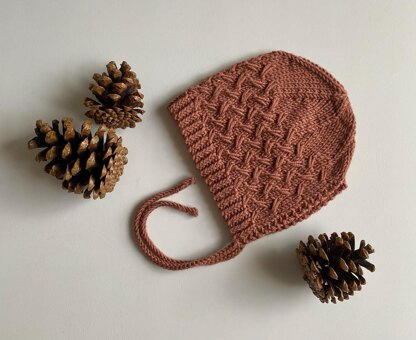 This bonnet is knitted in one piece, from front to back, starting with back & forth knitting, then joined and worked in the round, with the back closed by switching to double point needles.