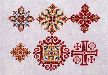 This collection of six crosses is inspired by crosses found in Byzantine liturgical textiles and church ornaments. Ranging in size from 2 x 2 inches to 3.5 x 3.5 inches and simpler to more ornate designs, they can be used in many ways. To apply to any non-counted thread fabric, simply use waste canvas. The photos show the designs worked with 2 strands of DMC floss in a red, gold, and pewter colorway to give the effect of the gold and silver threads but they can also be worked in three colors of your choosing.