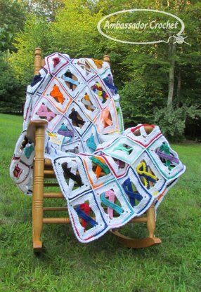 I worked on this design for months. There are 17 pages included in this pattern, which includes 3 pages of every ribbon color combo I could find. (hopefully I didn't miss any). There are 5 different ribbon directions, but only one square, so you can make all your squares to support one specific cause, or you can do a combination of any number of the almost 70 ribbons I have listed.