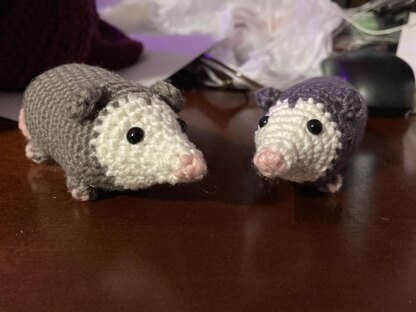 With just a little bit of scrap yarn and a couple hours of work, you can make a cute critter to join you on your travels! This marvelous marsupial is made entirely in one piece, with sewing only being needed for the optional mouth and pink toes. The pattern is mostly straightforward but has some slightly more complicated stitches to work the no-sew ears and feet. It’s a perfect pattern for an adventurous beginner or a more experienced crocheter looking for a quick project. Stick to the weight 3 yarn used in the pattern to get a 4”/10 cm long opossum, or use bulky blanket yarn to get a near-life-size version!