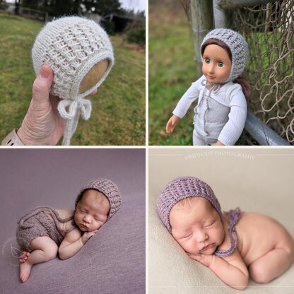 This is a pdf knitting pattern, written in English, using standard US terminology, for you to knit a DK weight Ayden Baby Bonnet photo prop in sizes preemie to one year (plus instructions for your 18" doll, as well).