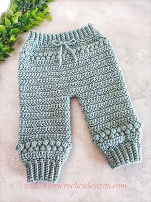 These cute high waist joggers are made top down using a herringbone half double crochet and a puff stitch. They are quick and easy to work up and match the Ayla Cardigan and Beanie.