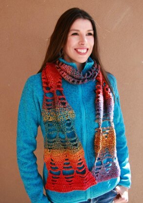 The Ayo Scarf is crocheted in a large scale lace pattern which flows from solid to open-work diamond motifs. Self-striping yarn adds an element of color to the dynamic geometric shapes. Careful blocking creates subtle waves along the side edges. Whether worn with jeans and a turtleneck or over a hip leather jacket, this versatile accessory will add interest to any outfit.
