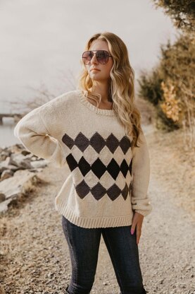 Ayr combines classic diamonds worked in shaped intarsia to create neat edges, with a split high/low hem and Fisherman Rib in this loose fitting, drop-shoulder pullover.