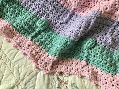 Balloons dance across the blanket with texture and style. Such a unique design. Fits any decor in any room. Simple crochet stitches throughout. CARON BRAND ONE POUND YARN USED IN THIS PATTERN.