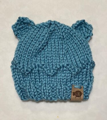 This is a quick-knitting newborn beanie with a chevron stripe and sweet little bear ears. Great for boys or girls, this hat is made from bulky yarn and uses less than one skein (I can get at least 2 of these out of one skein of Pacific Chunky).