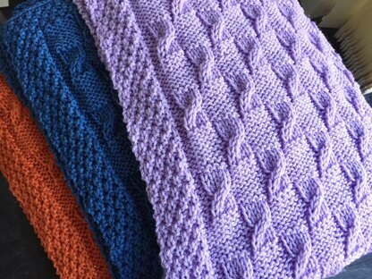 A very simple design to make a cables and checks baby blanket with an Irish moss stitch border.