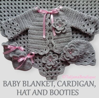 Crochet Pattern baby blanket, hat, cardigan and booties set decorated with crochet flowers, satin ribbon and pearl beads. ♥♥♥ Blanket pattern for 2 sizes: 27" x 27" (70cm x 70cm) and 31"x 31" (80cm x 80cm) - an ideal sizes for prams, pushchairs, car seats and moses baskets. Hat, Booties & Cardigan size in this pattern: 3 - 6 months. The pattern is written in US crochet terms but with a conversion at the beginning of the pattern to UK / Australian terms. Its just that some of the names of the stitches are different. Materials & tools you will need: ★ Acrylic or other yarn in grey colour approx. 350 gr - DK, Double Knitting in UK, Light Worsted in the USA, 8ply in Australia. ★ Crochet hooks sizes (G) 4mm, (7) 4.5mm and (J) 6mm. ★ 3 pearl beads in pink colour (optional). ★ Satin ribbon in pink colour 2 m.