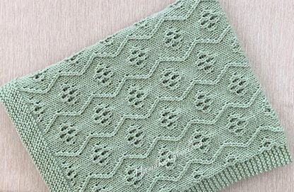 This baby blanket is knitted in a very cute stitch with zigzags and small "flowers". The zigzags and the flowers are shaped with twisted stitches, very fun to knit! :)