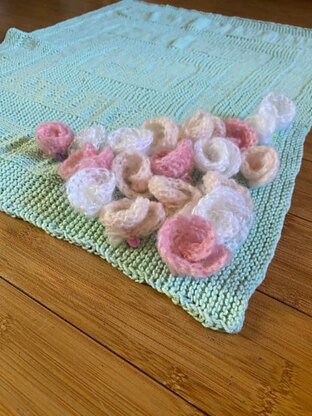 Knitted in stockinette and garter stitch with 50% cotton . The size its 56 cm x 70 cm ( 22" x 27") you need 160 170 g. and some mohair, wool or acrylic leftovers to make roses. The pattern is for beginners , has a lot of pictures and its very detailed written . I design it and I knit it before I wrote the pattern.