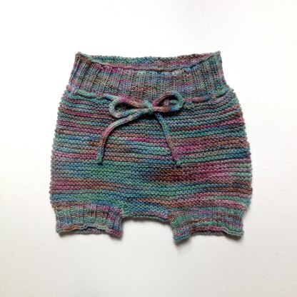 Diese niedliche kurze Babyhose ist von oben nach unten und in einem Stück gestrickt. Sie kann im Winter mit Strumpfhose getragen werden. Durch einige verkürzte Reihen auf der Rückseite passen sie Babypopos perfekt. Durch das Bindeband „wächst“ die Hose ein wenig mit. Als Garn eignen sich wunderbar weiche Merinoqualitäten. Die Anleitung ist für etwas fortgeschrittene Anfängerinnen, die schon einmal verkürzte Reihen gestrickt haben oder diese üben wollen.