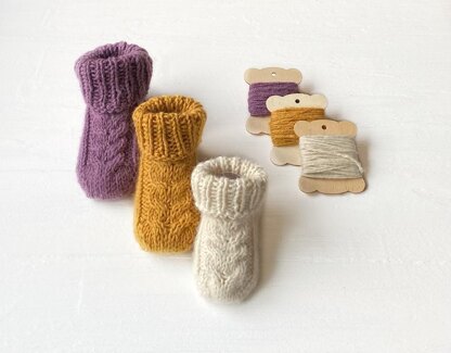 The pattern comes in 3 sizes: 3-6 months up to 10 cm (4”US) foot length; 6-12 months up to 12.5cm (4.9”US) foot length; 12-24 months up to 14-15cm cm (5.5”-6”US) foot length.