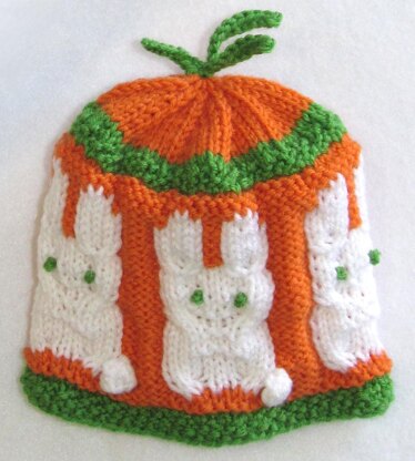 A Garden full of Bunnies around your Hat! Cabled bunnies knit in a single color, 2 colors or in 3-color Intarsia for a fun “pop” of color.