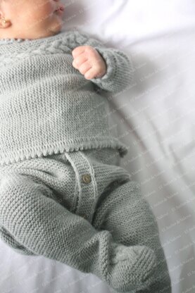 Product for digital download containing the instructions to make a woollen sweater for a newborn baby and leggings for a baby of 0 to 2 months, knitted in grey. The instructions include the description of the materials required to make the garments and the needle size used.