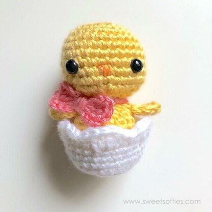 The ‘Baby Chick in Egg’ pattern is the perfect Easter surprise! This little hatchling is easy and quick to crochet with yarn held doubled, and makes an adorable children’s gift! The chick can be removed from the eggshell, and the bow and ribbon can be taken off as well. Kids will love playing with this cute toy.