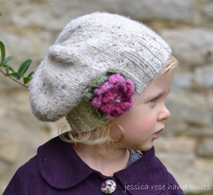 A pretty tweedy girls Aran hat with a knitted flower that is simple and quick to knit. This slouchy hat is knitted with Donegal Luxury Tweed Aran by Debbie Bliss.